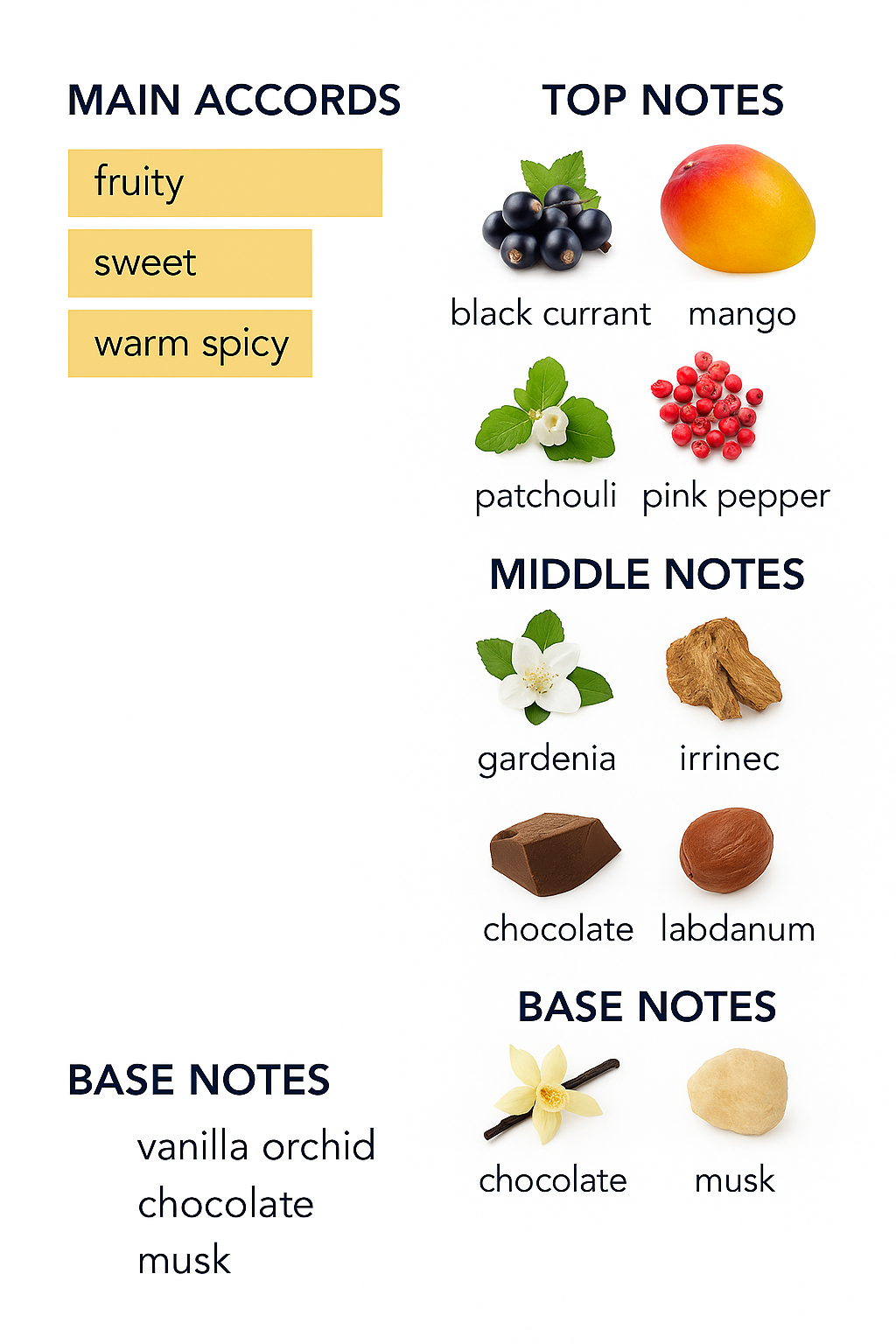 Agent Provocateur Fatale Eau de Parfum for Women 100ml Release Year 2018 Top notes: black currant, mango, and pink pepper Middle notes: patchouli, gardenia, and orris root Base notes: vanilla orchid, chocolate, musk, and labdanum