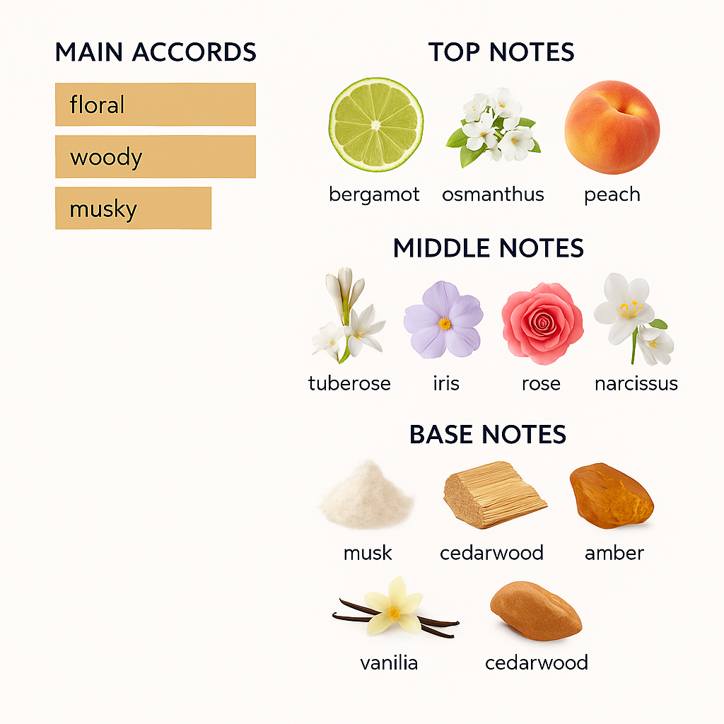 Second layer: Tuberose, Iris, Rose, Narcissus