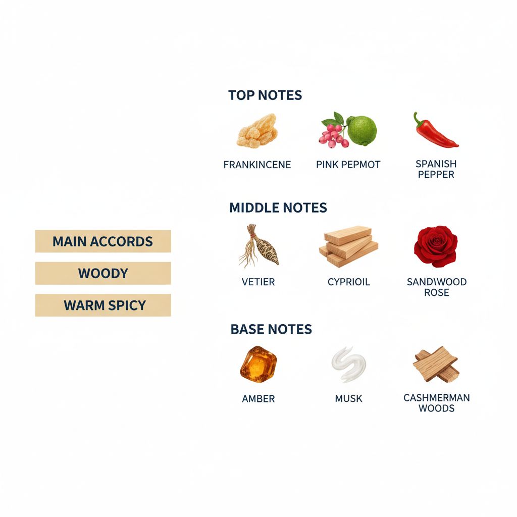 The scent opens with a sparkling blend of frankincense, pink pepper, bergamot, and Spanish pepper, offering a burst of freshness and spice.