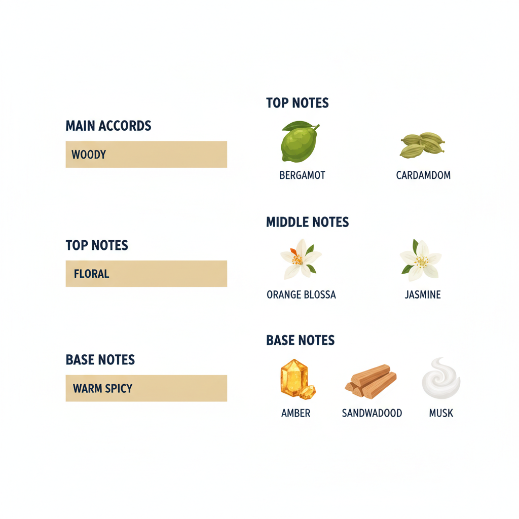A warm and long-lasting base of amber, sandalwood, and musk leaves a sensual and comforting trail.