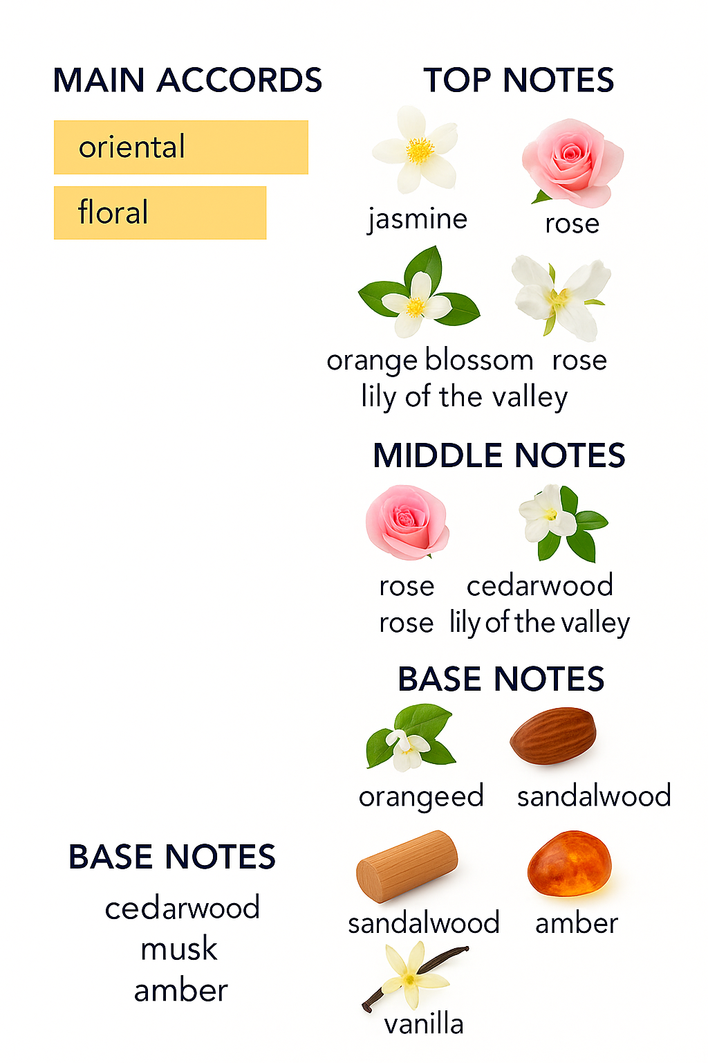 Base: Cedarwood, Sandalwood, Vanilla, Amber