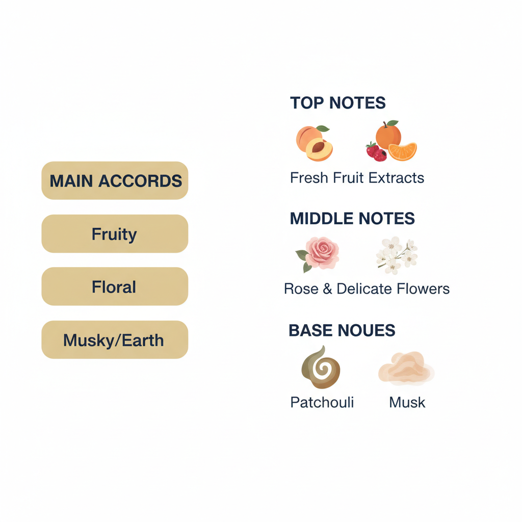 A soft and delightful blend of fresh fruit extracts, with a heart filled with the scents of roses and delicate flowers. This fragrance gives your spirit a touch of feminine luxury and softness, carrying hints of patchouli and musky notes that leave you with a sense of joy and love, perfect for ending your day.