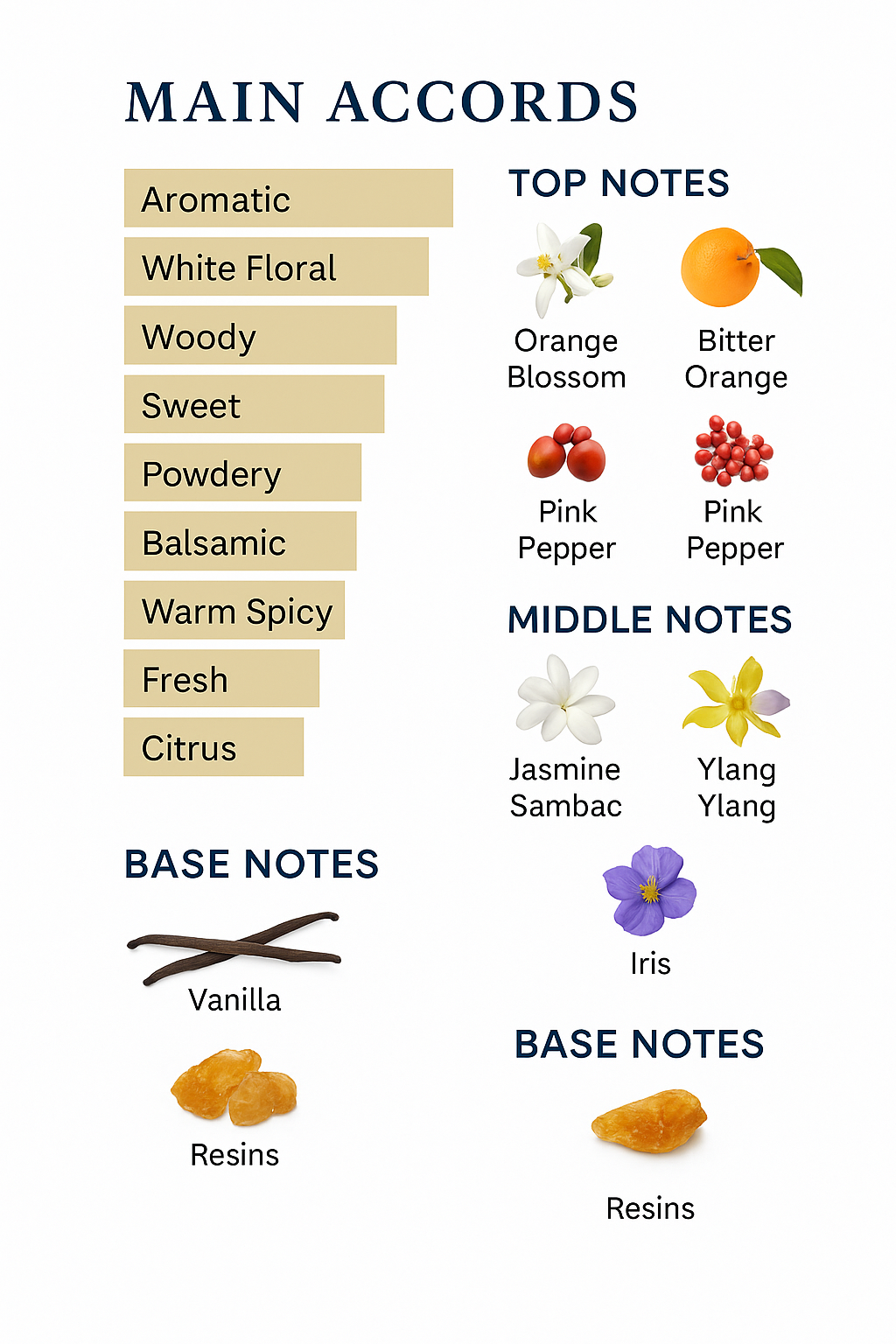 A balanced and harmonious fragrance: combining aromatic, woody, and sweet notes, to create a feeling of beauty and freshness.