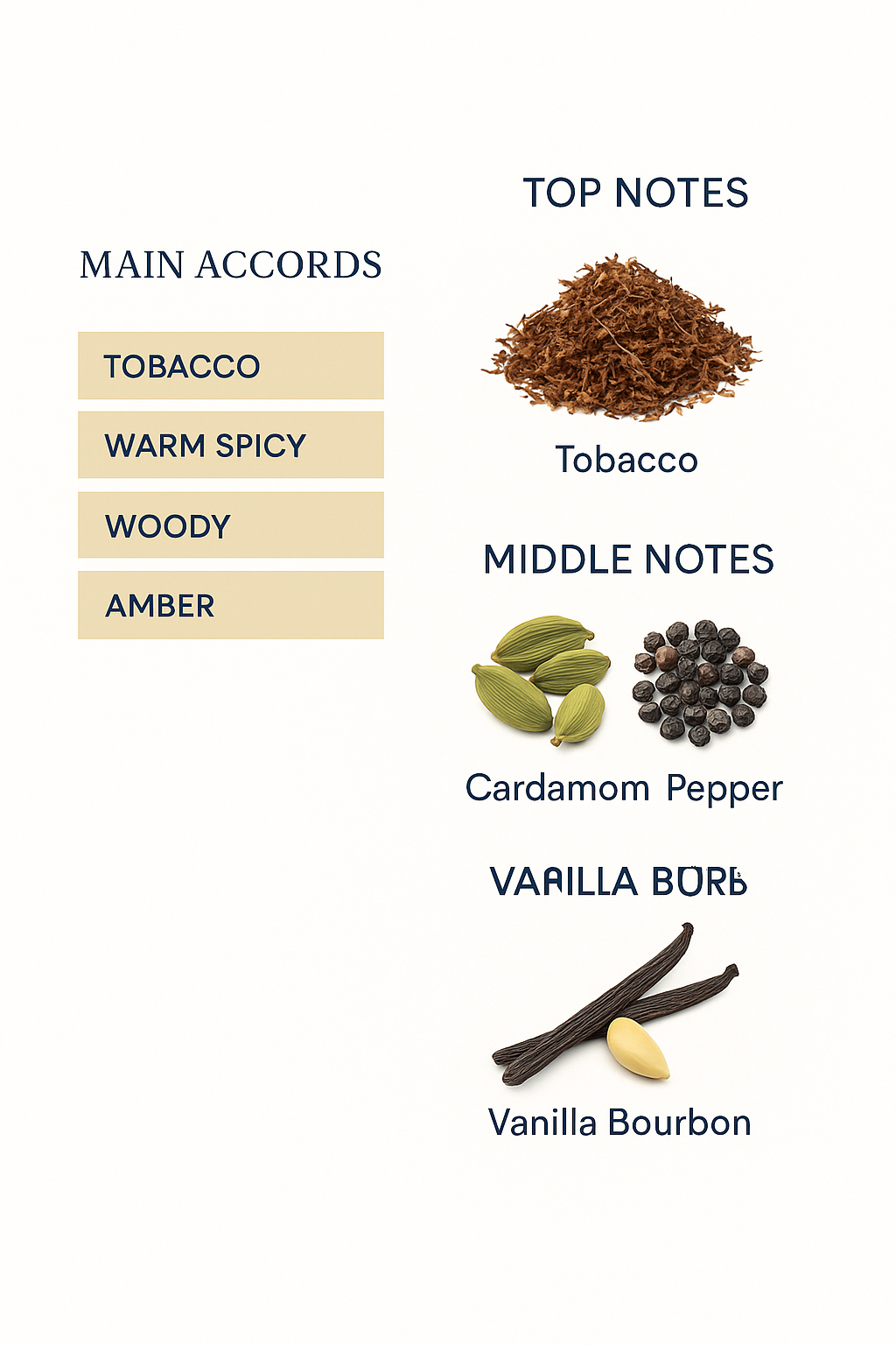 Wrapped in the luxury of tobacco, it has a dark and deep scent that penetrates the walls of your soul and reaches deep within. Rediscover yourself and express your power and authority with a tobacco blend spiced with the warmth of cardamom and the glowing colors of pepper. A precious and extremely intense fragrance, knotted with woody ambery notes of guaiac and benzoin, sweetened with warm vanilla bourbon. It is a legendary epic of a great man who leaves behind a rich history and a clear imprint that will remain in the minds for a long time.