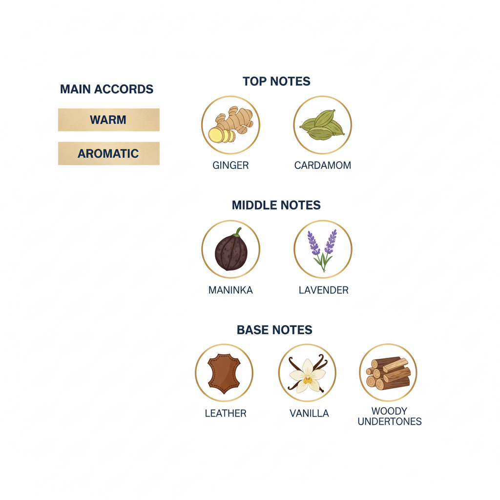Ginger, Cardamom, Maninka, Lavender, Leather, Vanilla, Woody undertones.