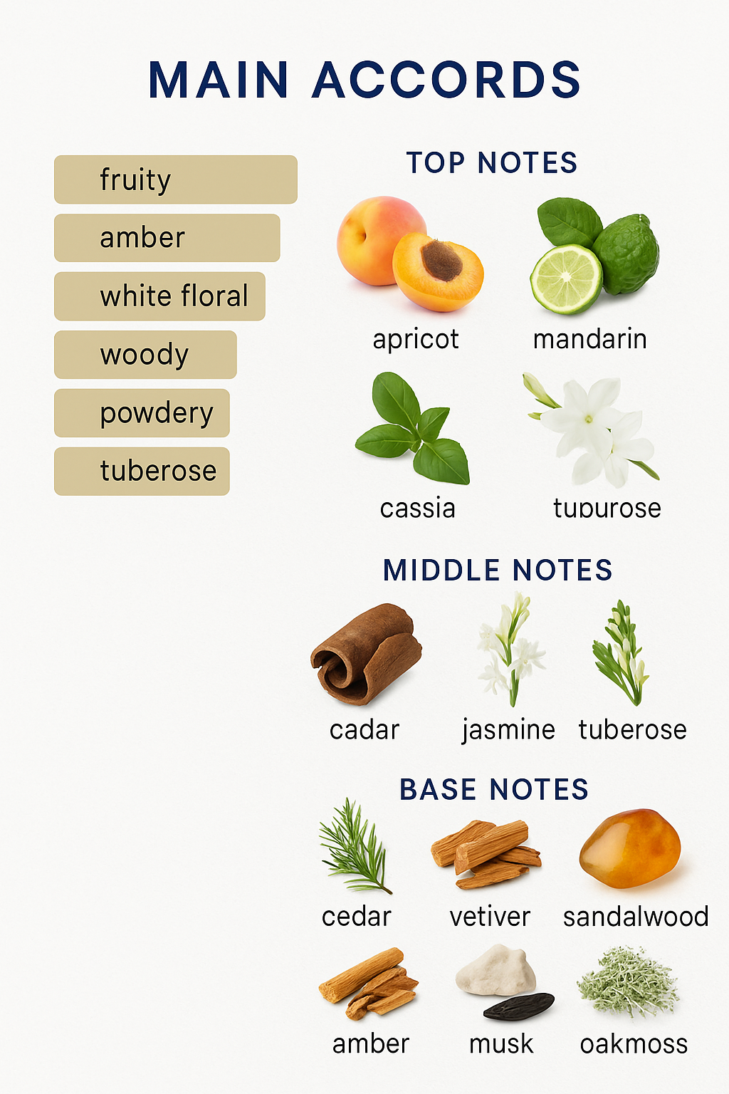 It features a rich blend of apricot, mandarin, bergamot, basil, cassia, jasmine, tuberose, cedar, vetiver, sandalwood, amber, musk, tonka bean, and oakmoss.