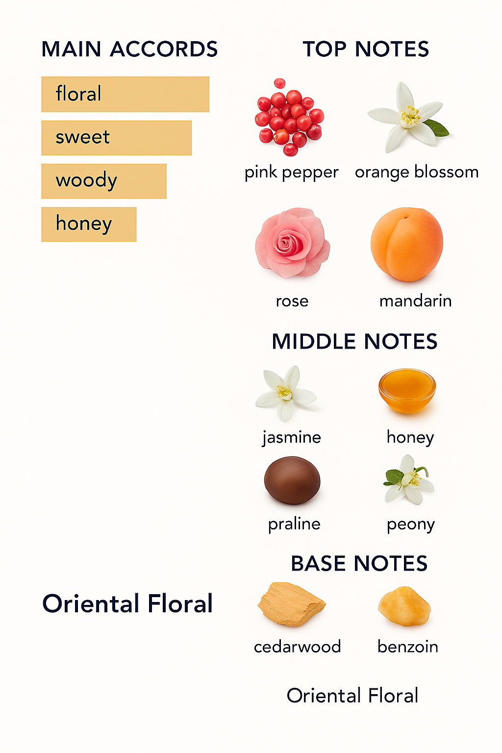 Top notes are pink pepper, orange blossom, rose and mandarin.