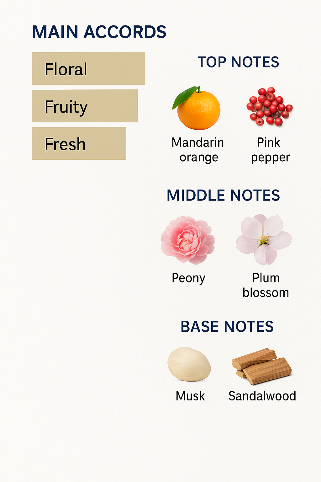 The fragrance opens with a fresh scent of mandarin and pink pepper which blends perfectly with a seductive heart scent of peony and plum blossom.