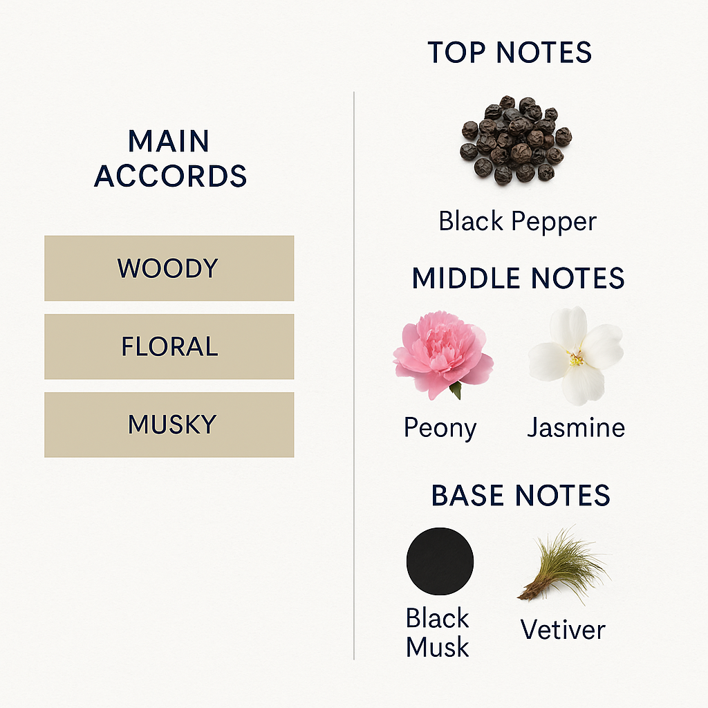 This fragrance tells a new chapter of your life, unveiling the details of beauty and pleasure. Simply relax and inhale the scent of peony and jasmine, enveloped in warm notes of black pepper. Enjoy your entire evening, from start to finish, with the elegance of black musk and vetiver.