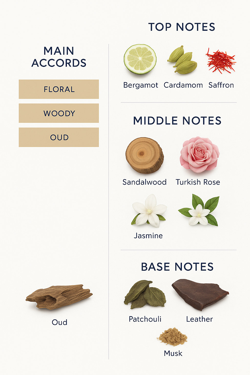Heart Notes: Sandalwood, Turkish rose, jasmine