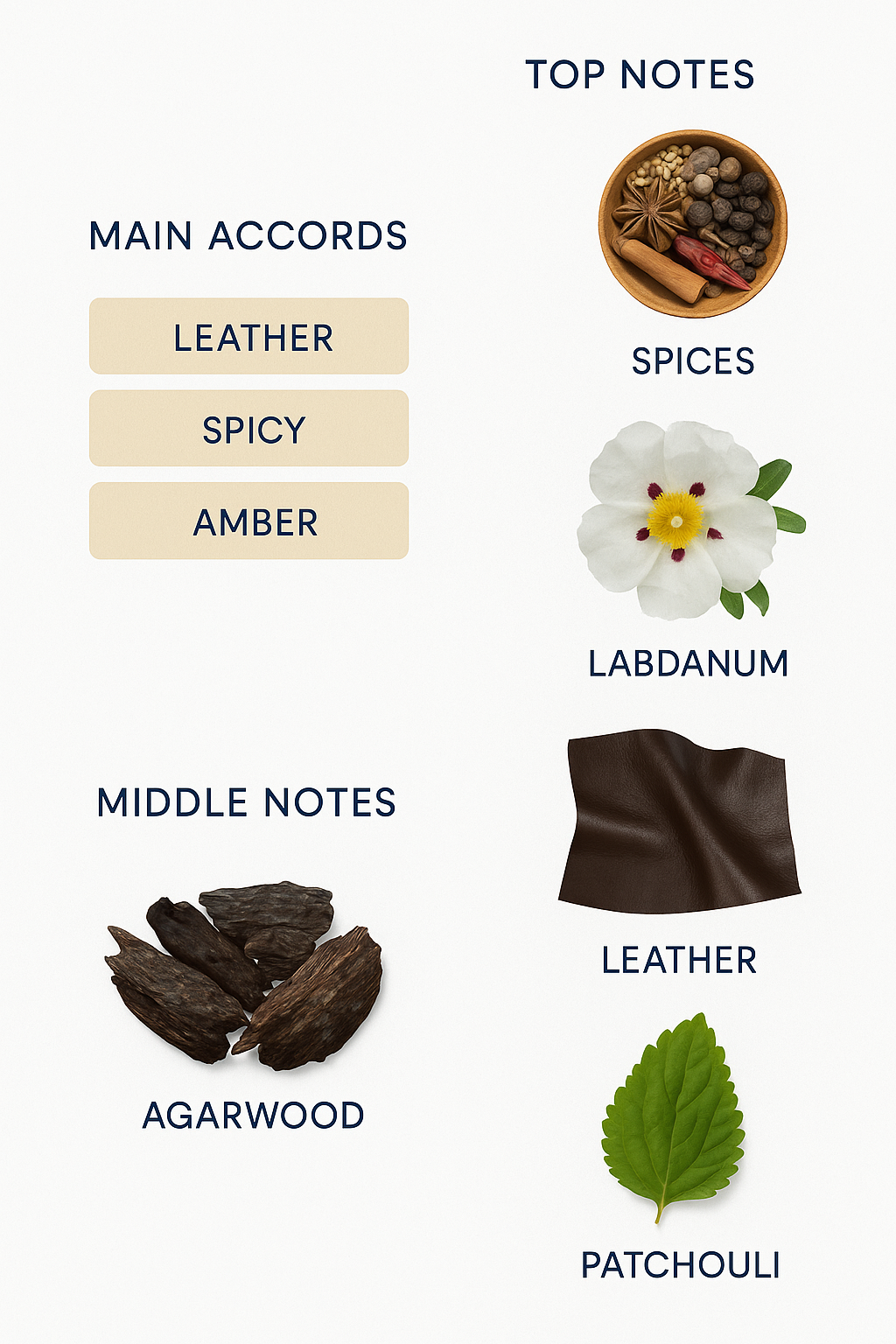 It is rich in bold leather notes, wrapped in warm spices and labdanum, offering a unique elegance and irresistible allure from the very first impression.
