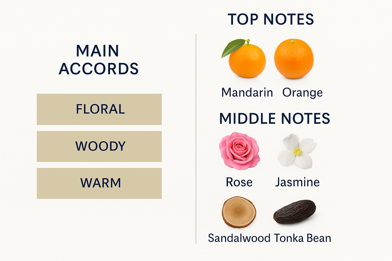 Base notes: A warm, deep composition of sandalwood and tonka beans.