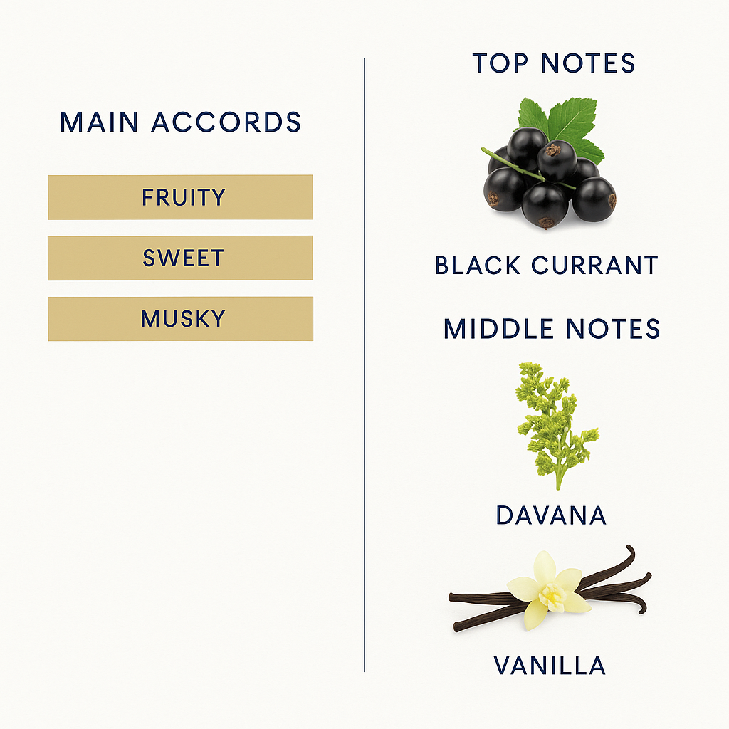 A soft aura that reveals your stunning beauty at every occasion and special outing, with a blend of black currant, Roman musk, and the fragrance of davana wrapped in delicate vanilla beads. It creates a scent that is both captivating and unique.