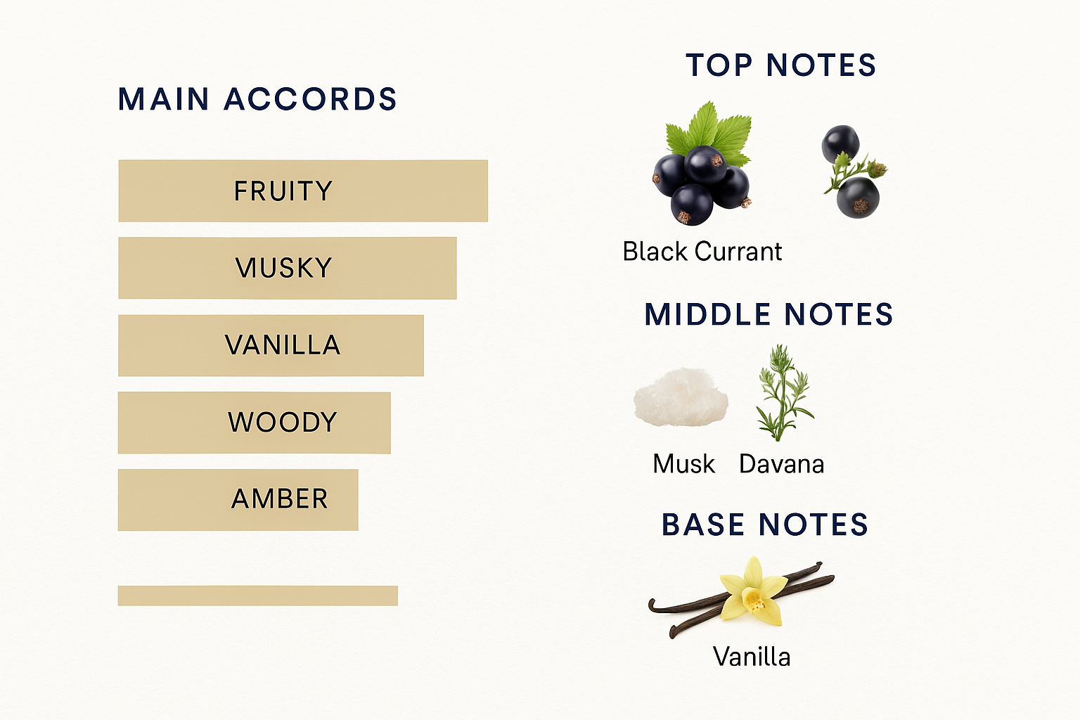 A soft, elegant fragrance that reveals your captivating beauty at every occasion and special outing. The blend of black currant, musk, and davana, enriched with soft vanilla beads, creates a unique and attractive scent that will make you feel alluring and unforgettable.