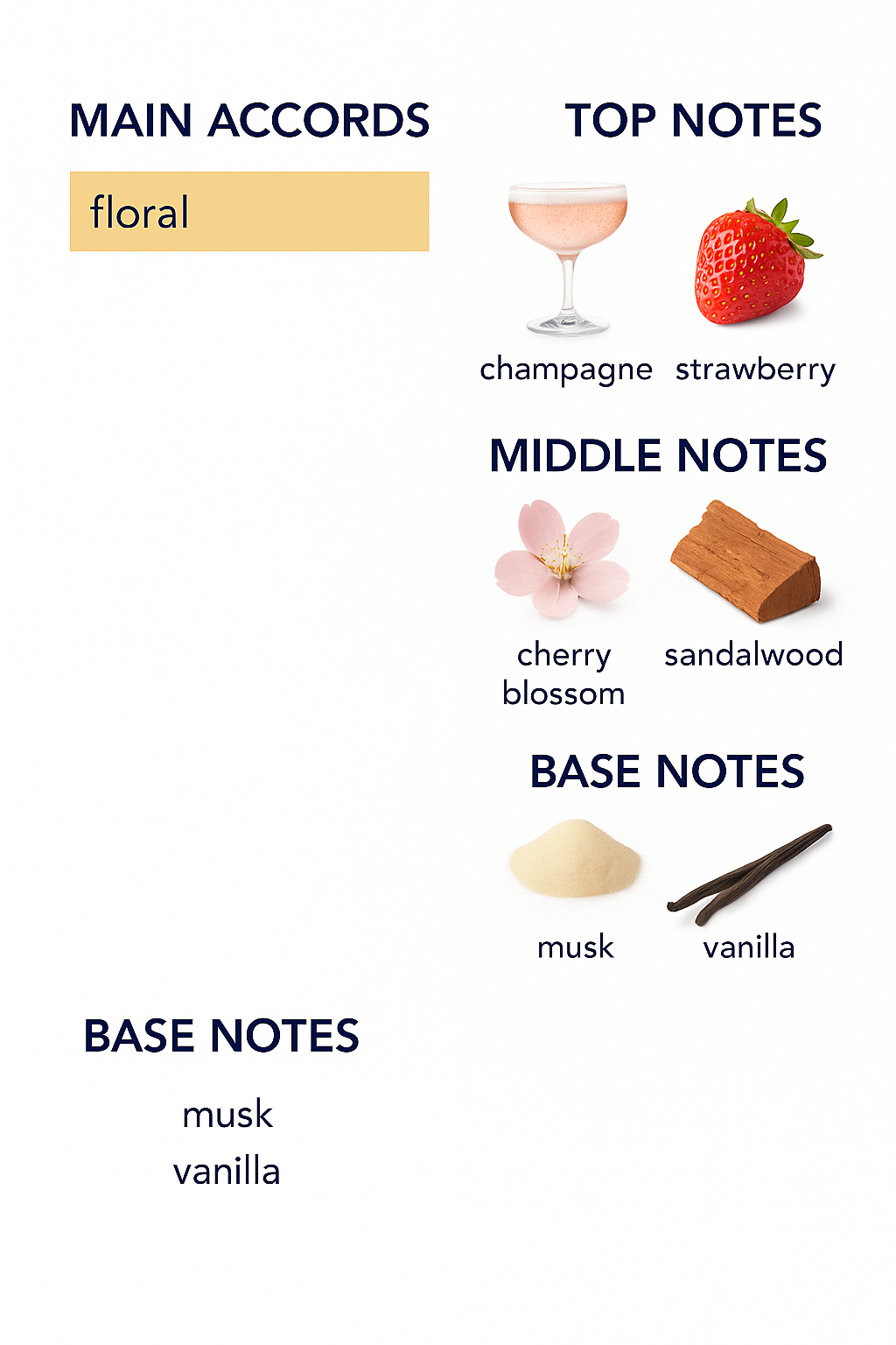 Top Notes: The fragrance opens with enchanting notes of pink champagne and strawberry, blended with refreshing notes of bergamot, creating a unique and attractive blend.