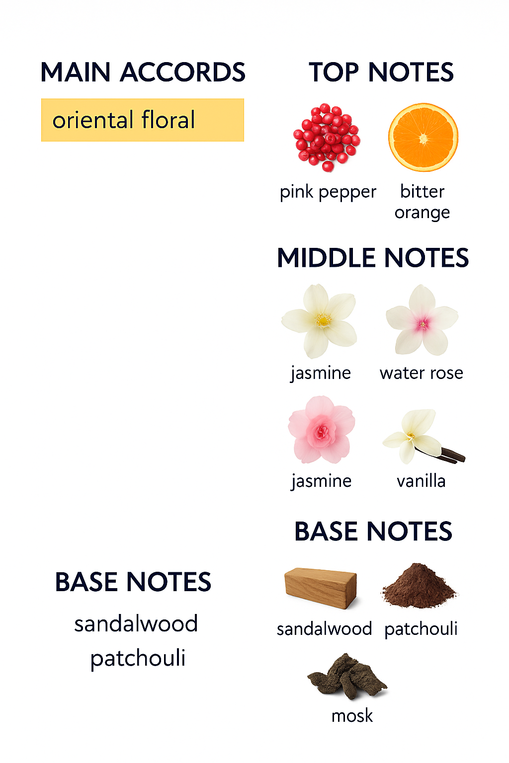 Top Notes: The fragrance's journey begins with a floral freshness that combines pink pepper and bitter orange, giving the fragrance a touch of vitality and freshness.