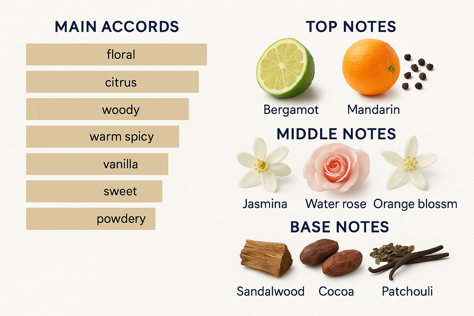 Base Notes: The fragrance concludes its warm oriental journey with a rich base that combines sandalwood, cocoa, and vanilla, with a touch of patchouli, giving the fragrance depth and long-lasting stability.