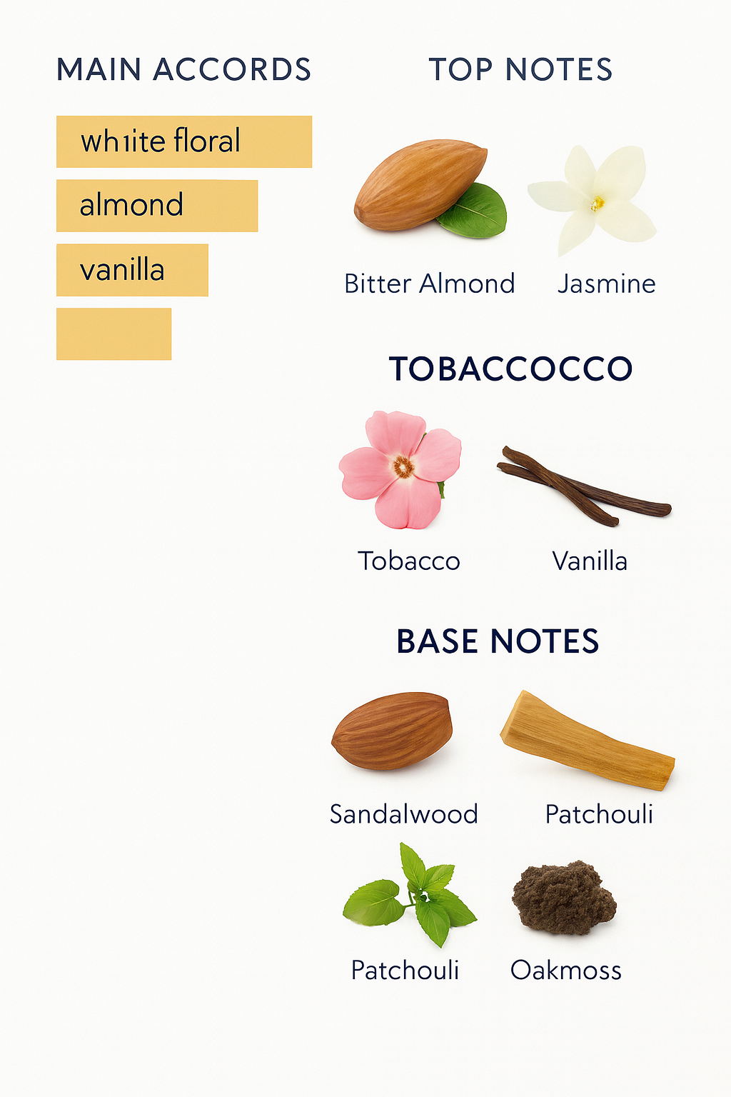 Top Notes: The fragrance opens with enchanting notes of bitter almond and jasmine, blended with refreshing notes of bergamot, creating a unique and attractive blend.