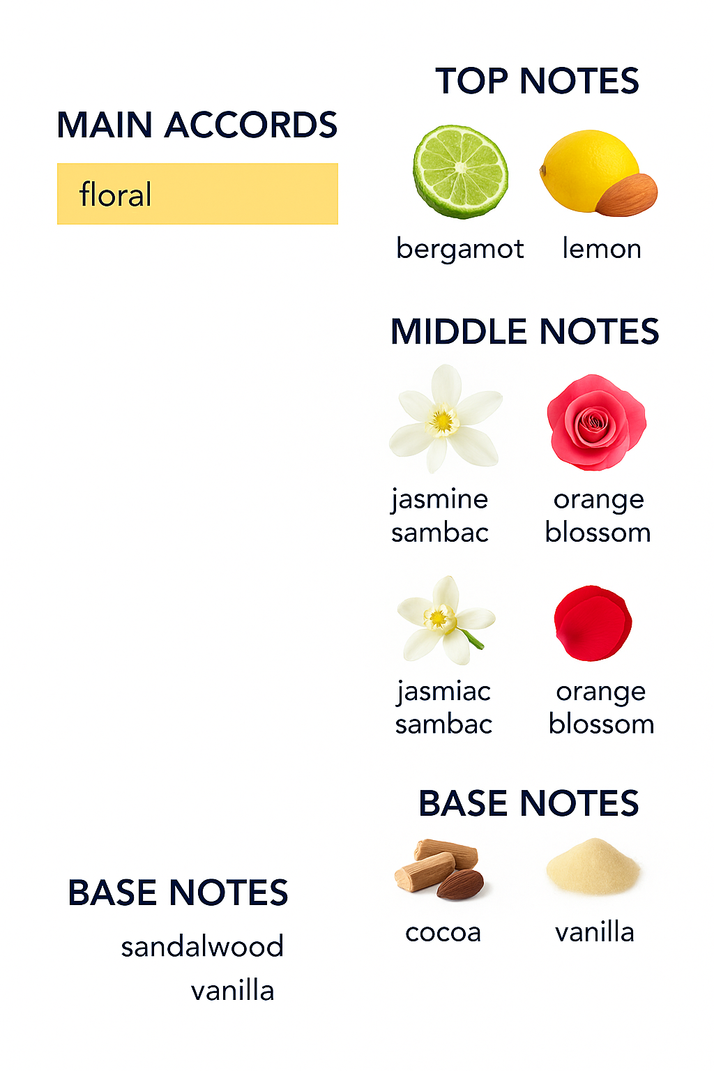 Heart of the fragrance: The fragrance then moves to a rich floral heart that combines jasmine sambac, rose de Mai, and orange blossom, giving the fragrance a touch of femininity and attraction.