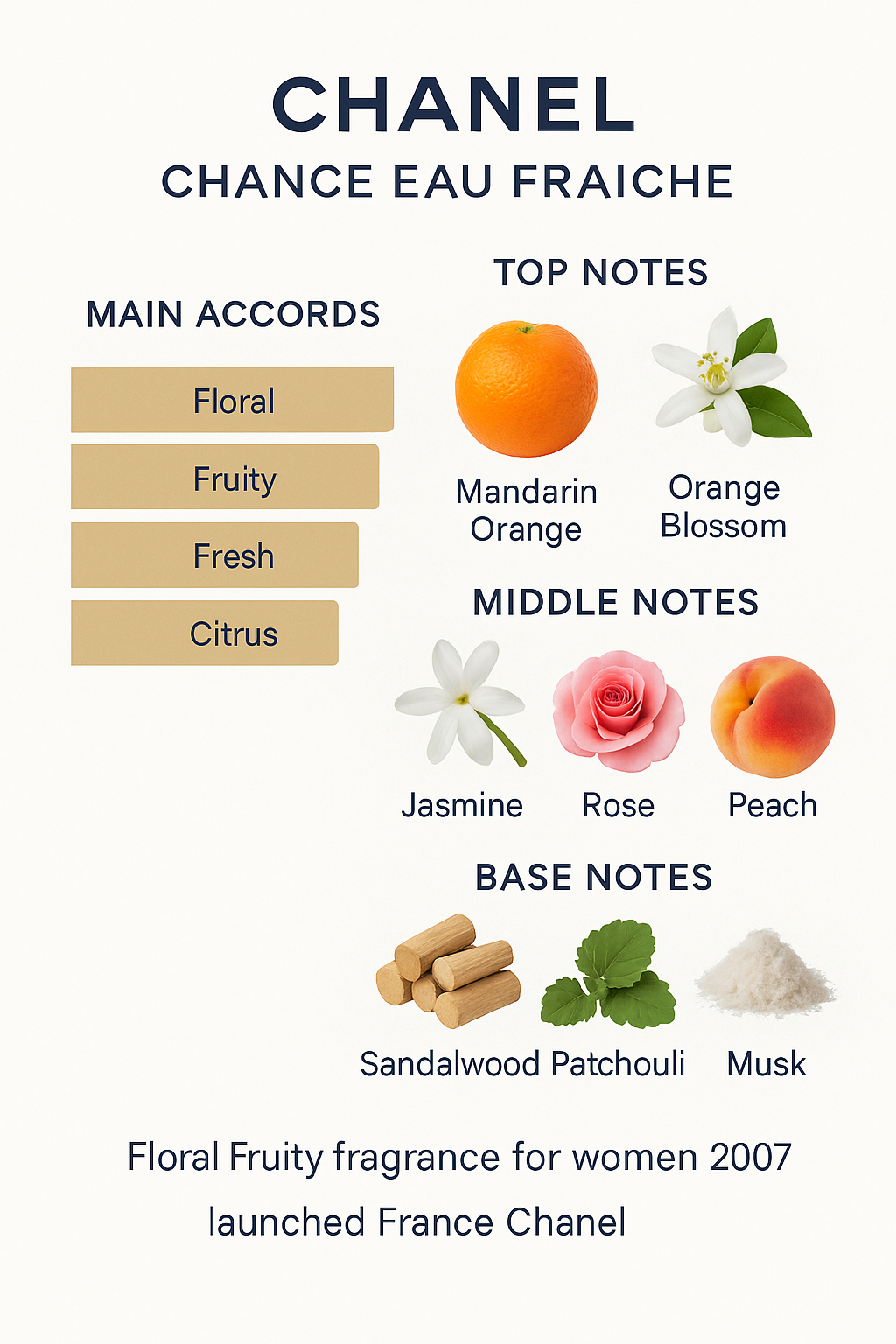 This fragrance features a wonderful blend of floral and fruity notes, giving it an attractive and refreshing feminine character. A journey through the scents of Chanel Chance Eau Fraiche.