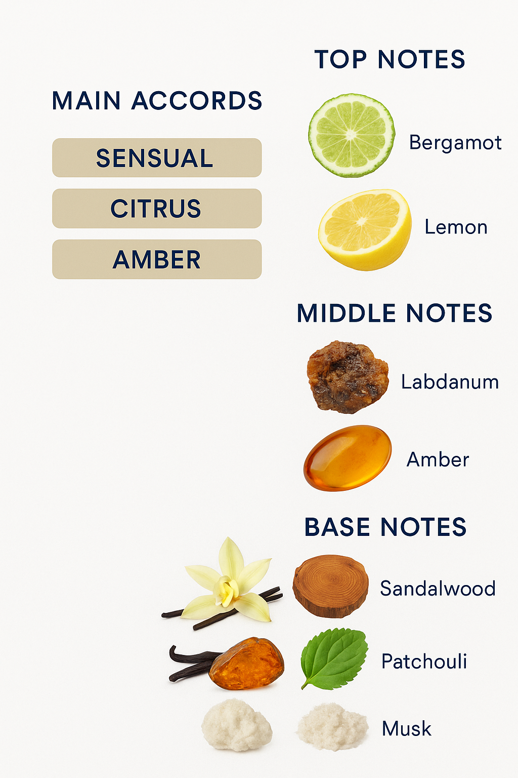 The fragrance opens with a fresh scent of bergamot and lemon that blends perfectly with the seductive heart scent of labdanum and amber.