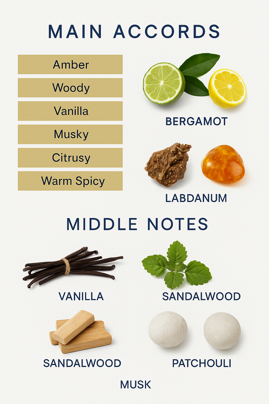 The fragrance opens with a fresh scent of bergamot and lemon that blends perfectly with the seductive heart scent of labdanum and amber.