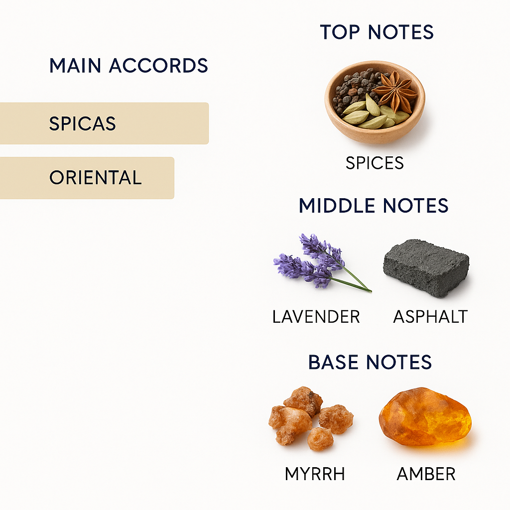 The heart of the fragrance consists of lavender and asphalt.