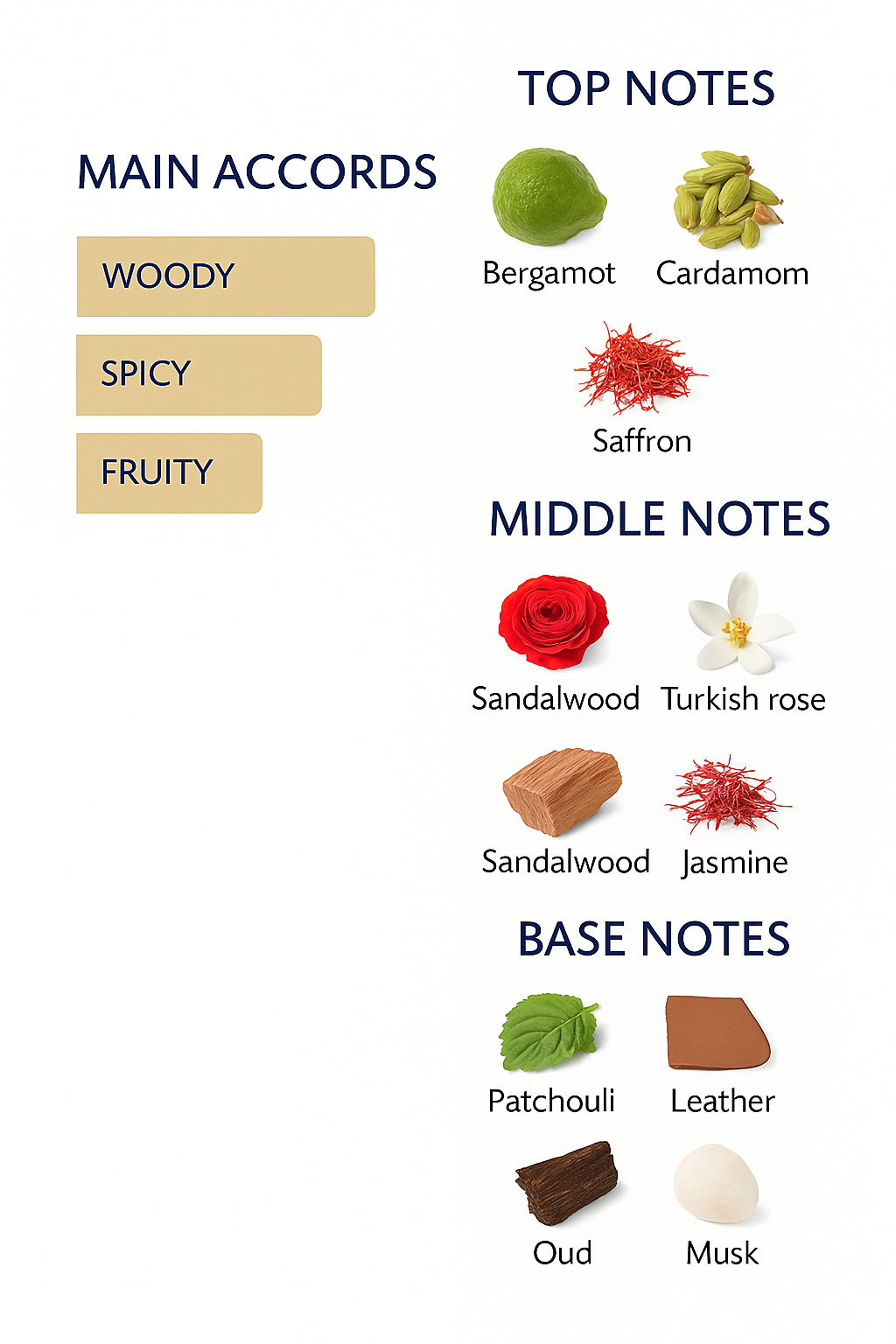 The fragrance closes with a base of oud, patchouli, leather, and musk.