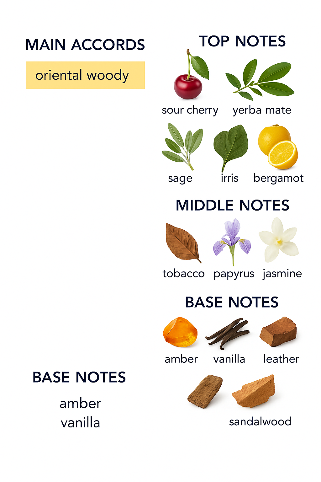 A unique oriental woody fragrance that combines sour cherry, neroli, yerba mate, violet leaf, sage, bergamot, lemon, mandarin orange, grapefruit, tobacco, papyrus, iris, jasmine, amber, tonka bean, vanilla, leather, sandalwood, labdanum, musk, cashmere wood, patchouli, moss, and vetiver.