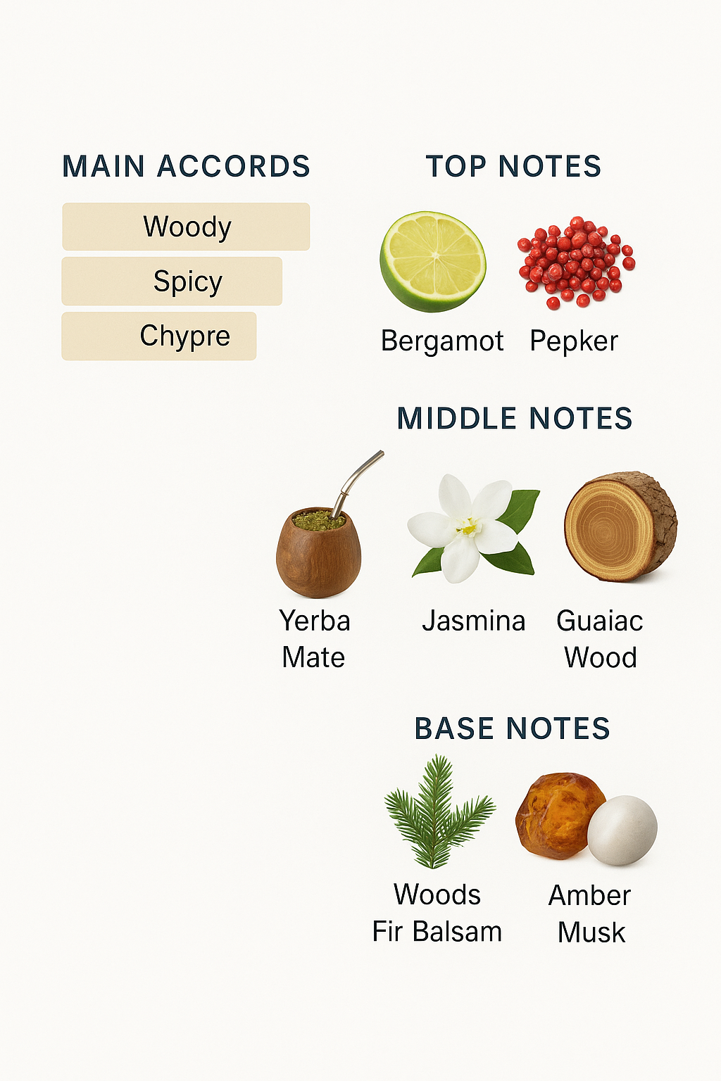 Heart notes: yerba mate, Chinese jasmine, jasmine sambac, and guaiac wood.