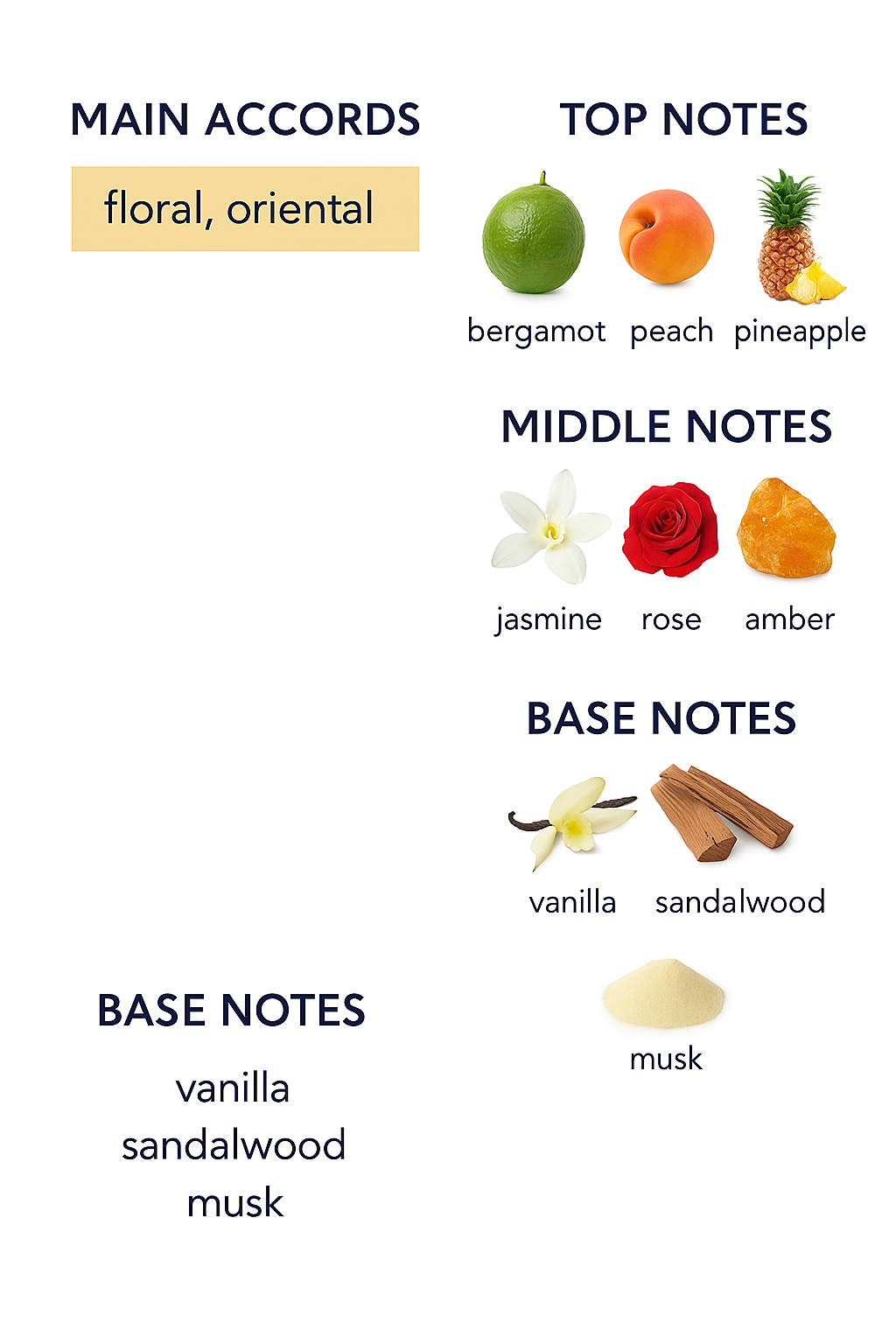 Base: The scent ends with warm notes of vanilla, sandalwood, and musk, giving the fragrance long-lasting durability and irresistible warmth.
