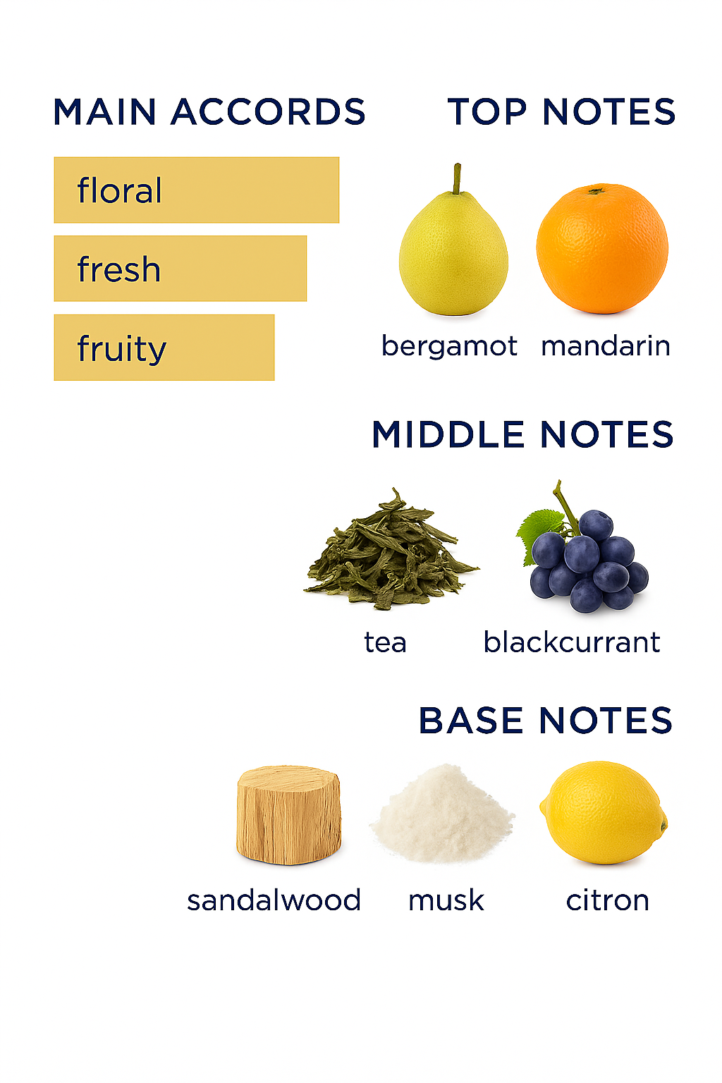 The aromatic line is a fresh and fruity fragrance for men that adds a touch of delicacy to the modern man. It combines fresh, rejuvenating and pure ingredients. Recommended for regular use. The perfumer is Olivier Creed, from the sixth generation of the prestigious Creed family. The scent opens with citrus notes of bergamot and mandarin. The heart of the fragrance is tea and black grapes. These two ingredients give the fragrance a very soft and refreshing touch, making it suitable for women and men. The base of the fragrance is sandalwood, musk and orange or citron oil. Suitable for summer and those who love fresh and calm fragrances.