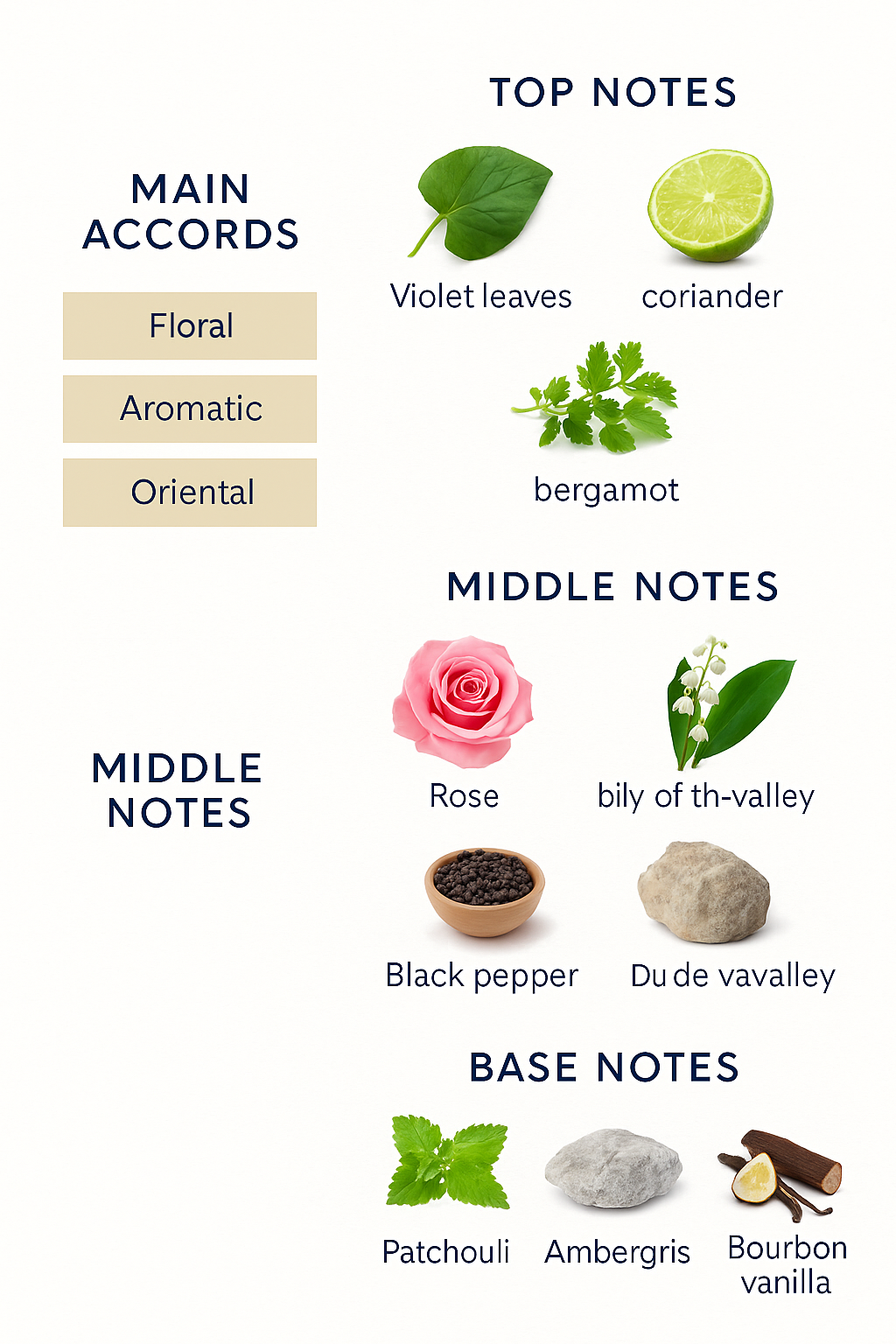 A noble composition that exudes luxury, beginning with soft herbal and citrusy notes, centered by a spicy floral heart, and concluded with a warm oriental base that exudes elegance and stability.