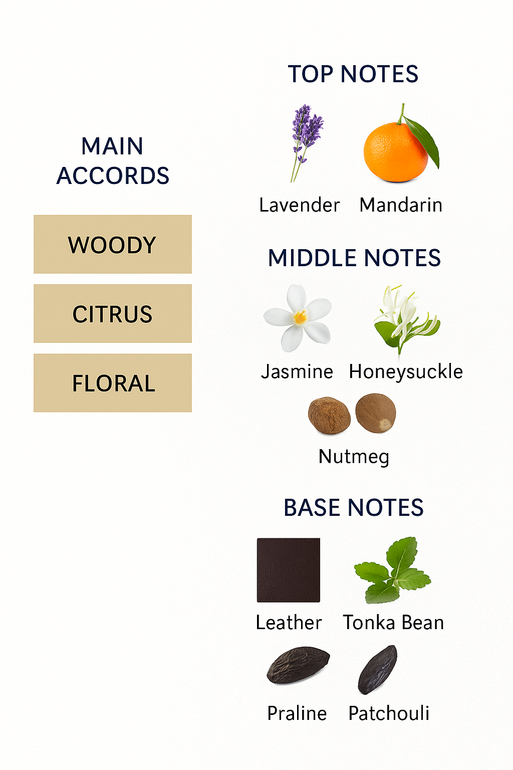 A men's fragrance that belongs to the woody group, giving the scent a serious and powerful effect. Its top notes are lavender and mandarin, and its middle notes are jasmine, honeysuckle, and nutmeg. The fragrance ends with a base of leather, tonka bean, and patchouli.