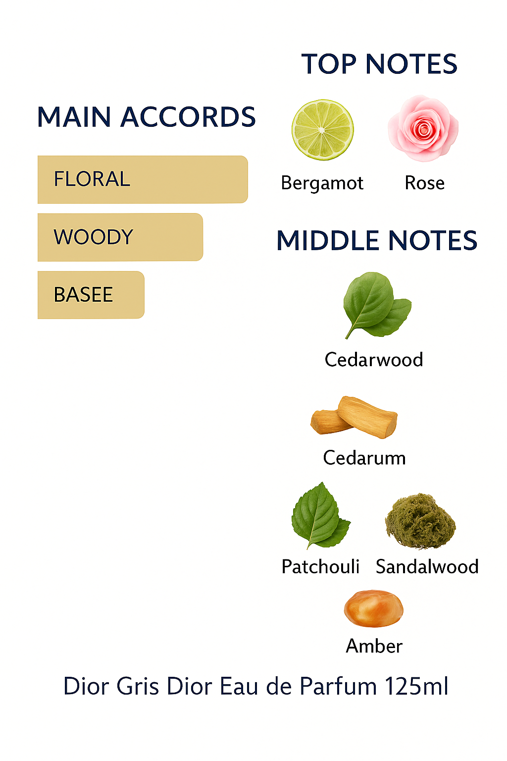 - The fragrance releases a fresh scent with bergamot and rose, accompanied by cedarwood, patchouli, sandalwood, oak moss, and amber.