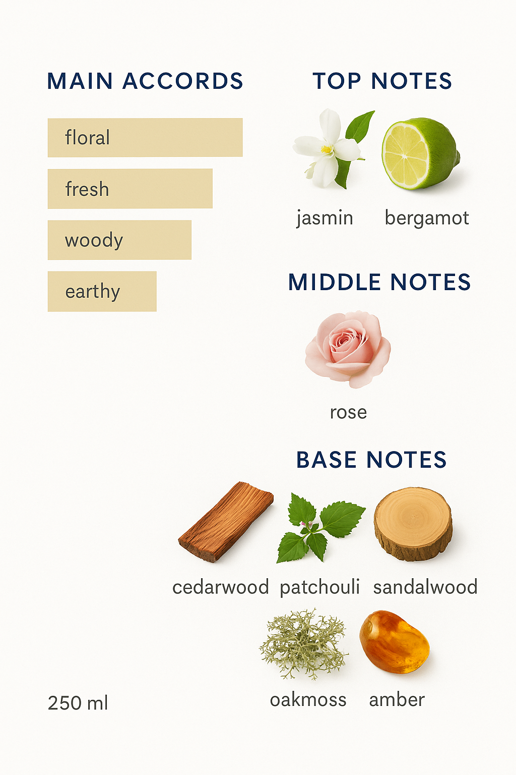 Multifaceted and effortlessly elegant, this composition blends jasmine and bergamot with floral notes. The fragrance releases a fresh scent of bergamot and rose, accompanied by cedarwood, patchouli, sandalwood, oakmoss, and amber.