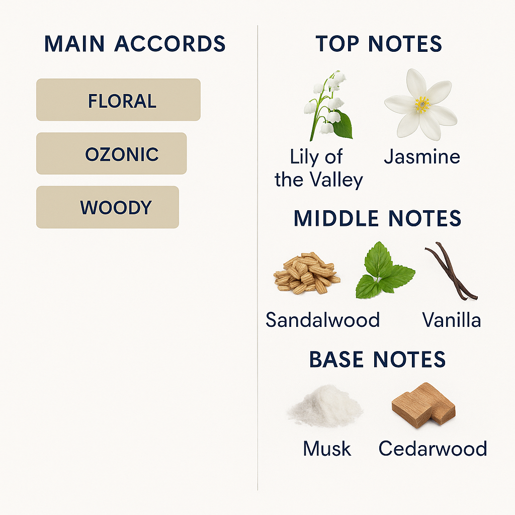 It features a pure, fresh scent with a blend of white flowers and ozone.