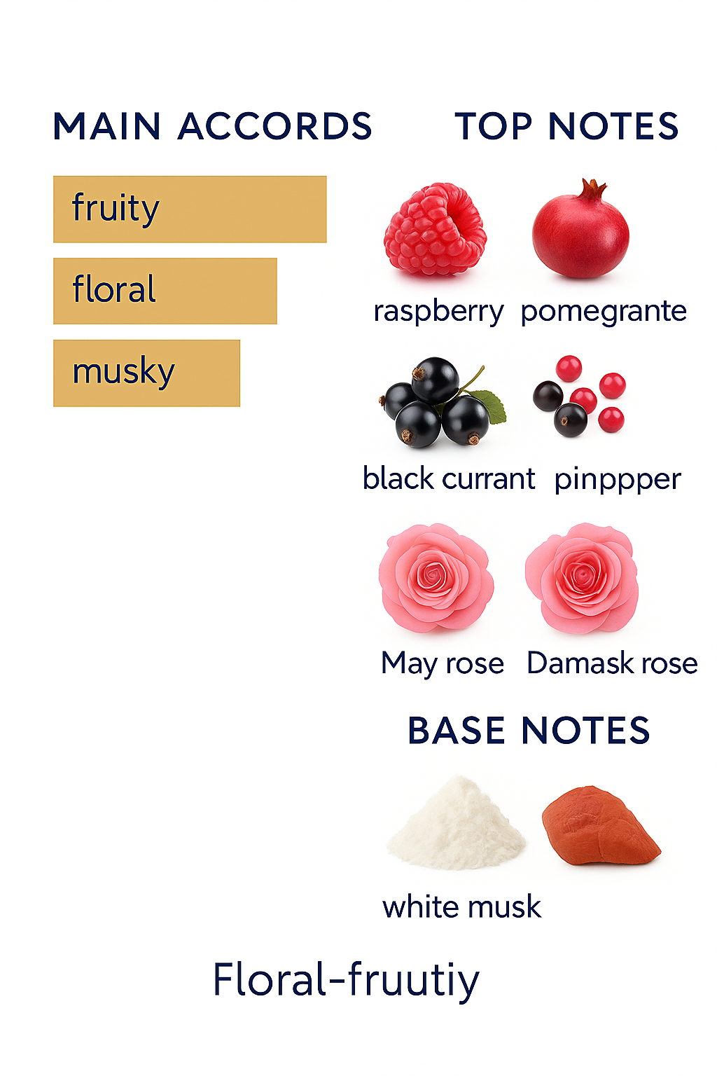 Top notes: raspberry, pomegranate, black currant and pink pepper.