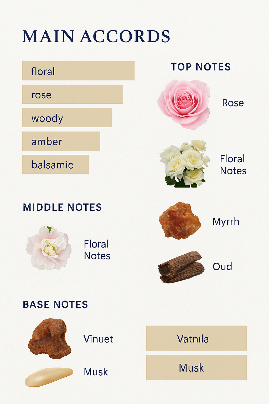 The fragrance combines strong woody notes of oud wood with delicate floral notes of rose.