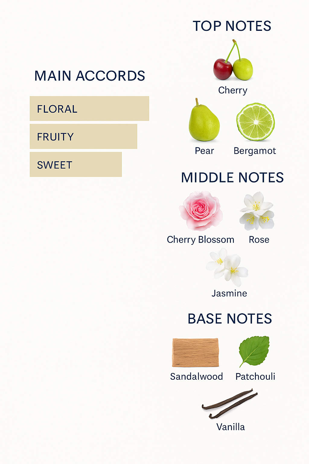 The fragrance opens with notes of cherry, pear, and bergamot.