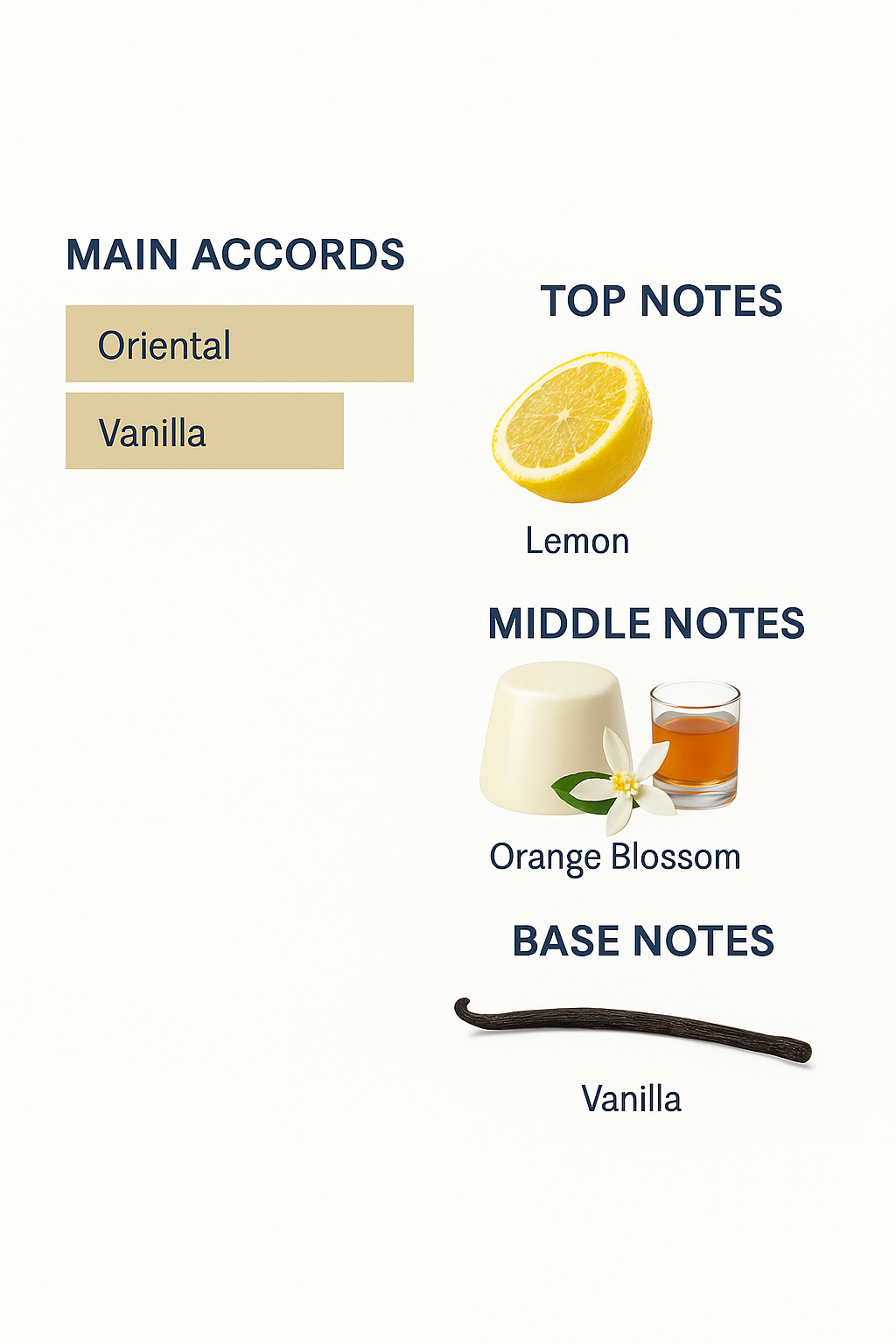The heart of the fragrance is panna cotta, orange blossom and rum;