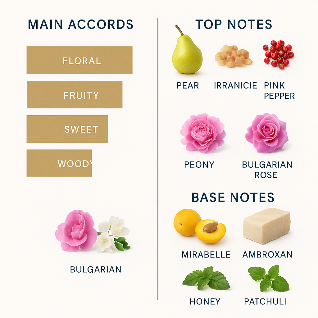 The base notes are mirabella bergamot, honey, ambroxan and patchouli.