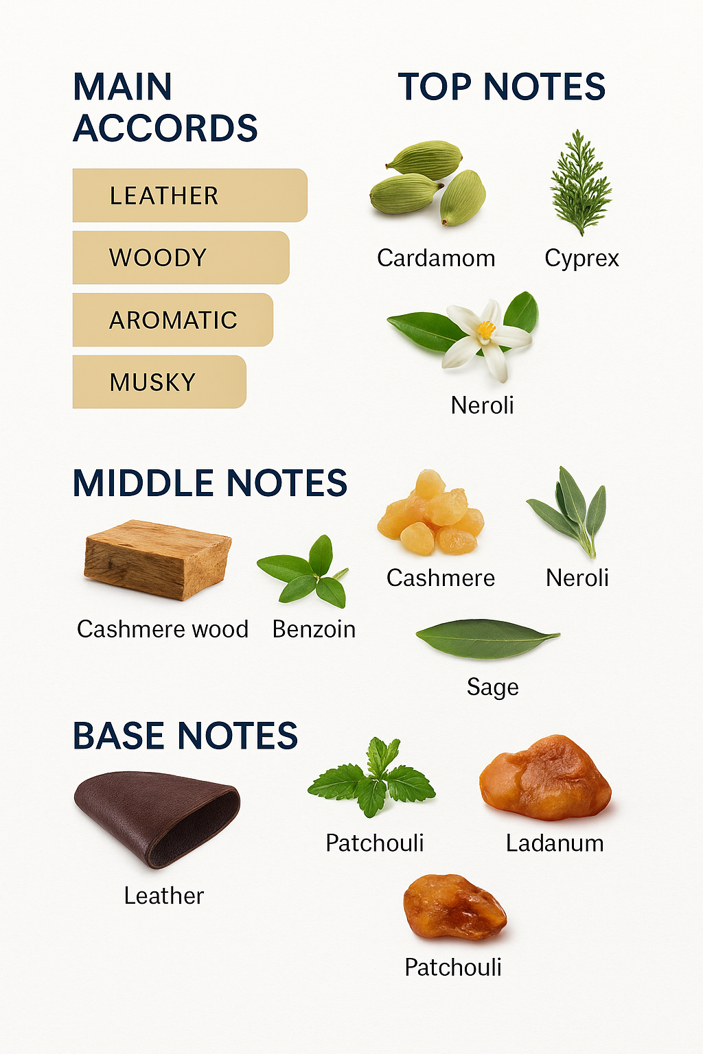 Heart notes: cashmere wood, benzoin, neroli and sage;
