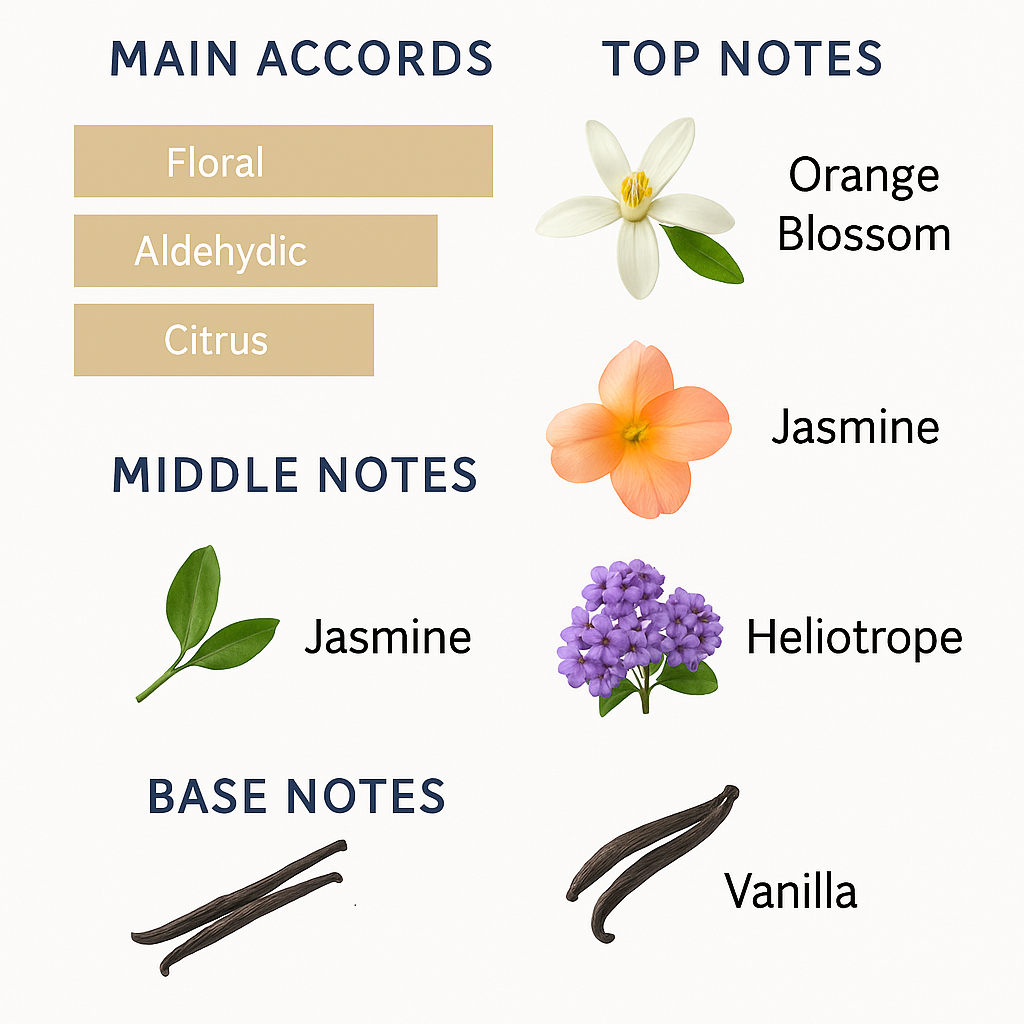 Heart notes: carnation, marigold, coriander, orange blossom, lily, jasmine, Bulgarian rose and lily-of-the-valley;