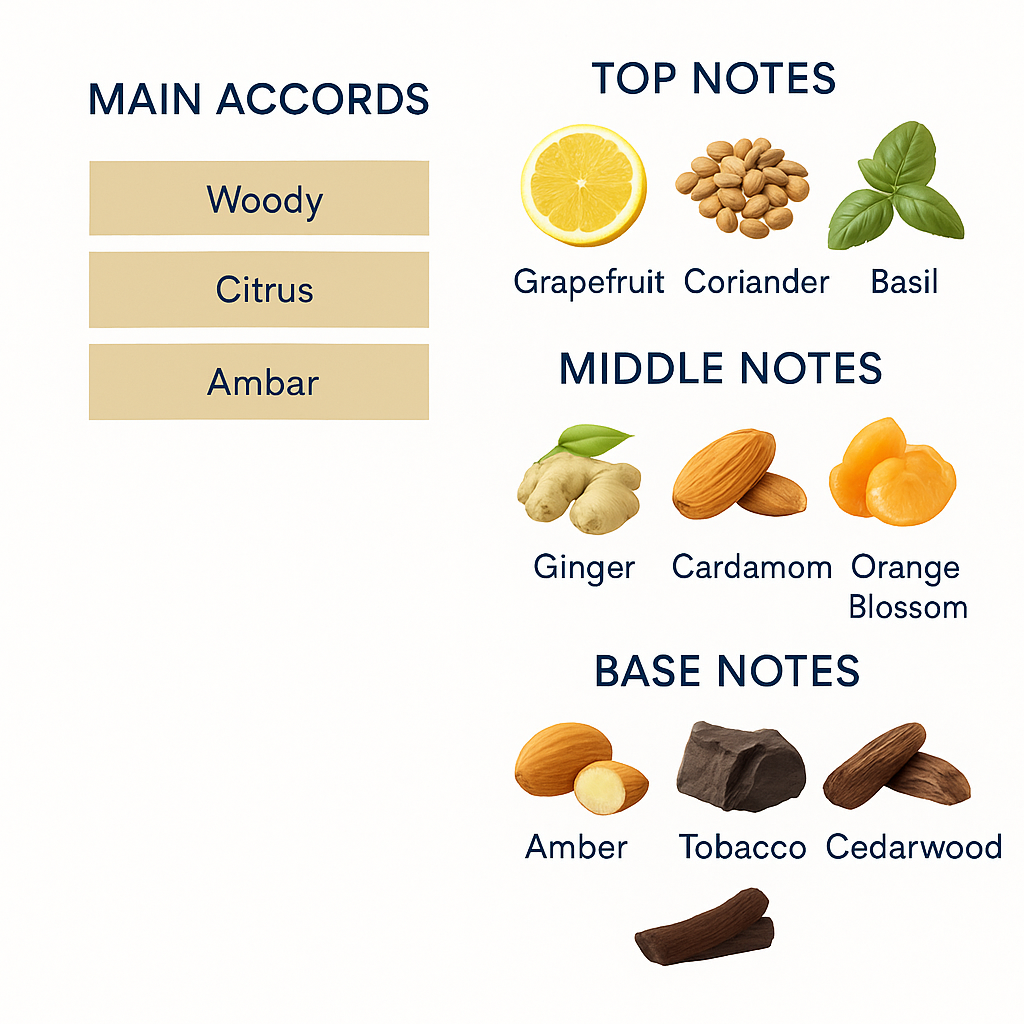 A woody fragrance for men that is distinguished by its sensitivity, elegance, and attractiveness. It is refreshing for all times, with a wonderful blend of tobacco extract, spices, grapefruit, coriander, and basil, with touches of cardamom and ginger that highlight the beauty of your appearance.