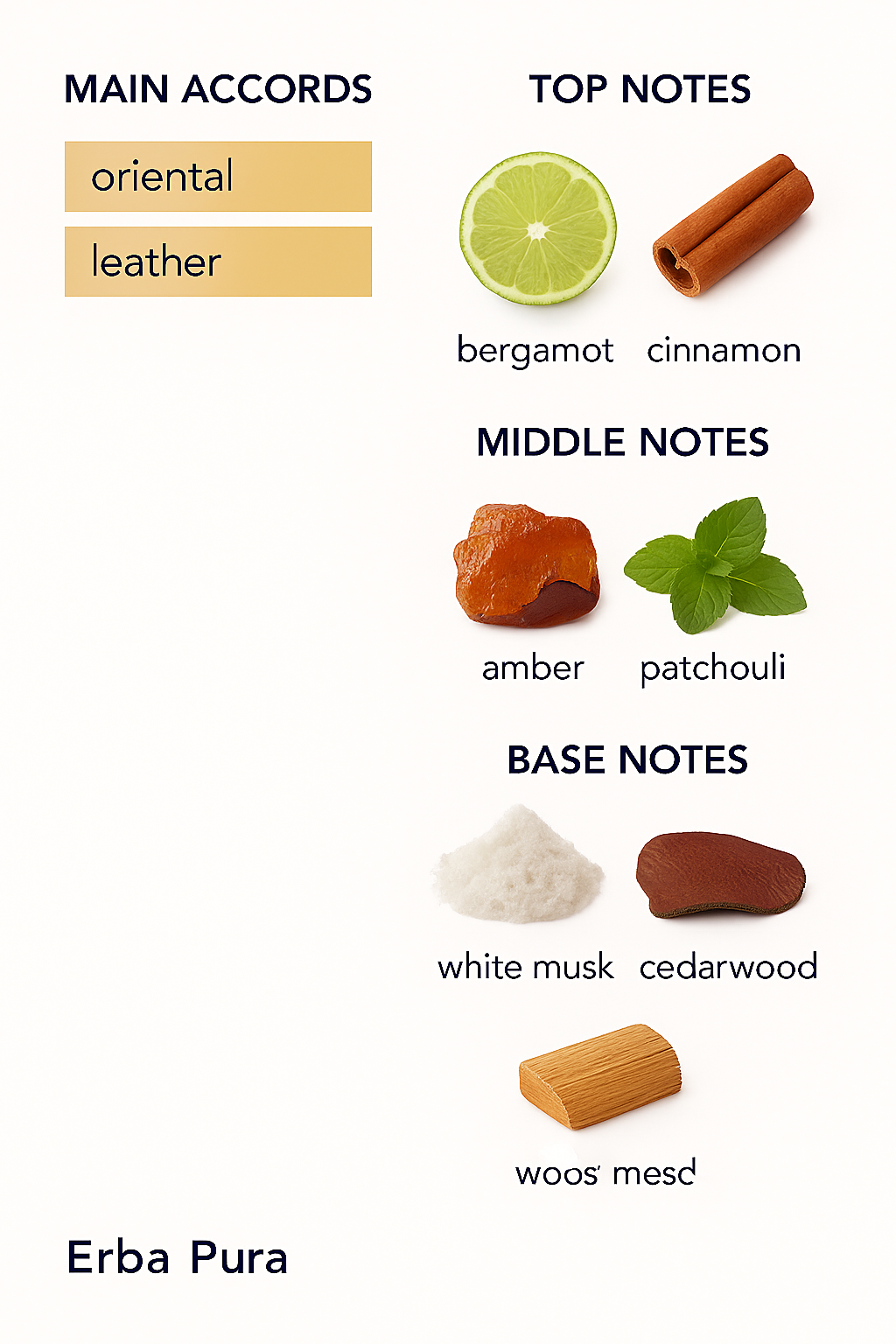 A unique fragrance: blending fresh oriental notes with warm leather scents and a touch of white musk.