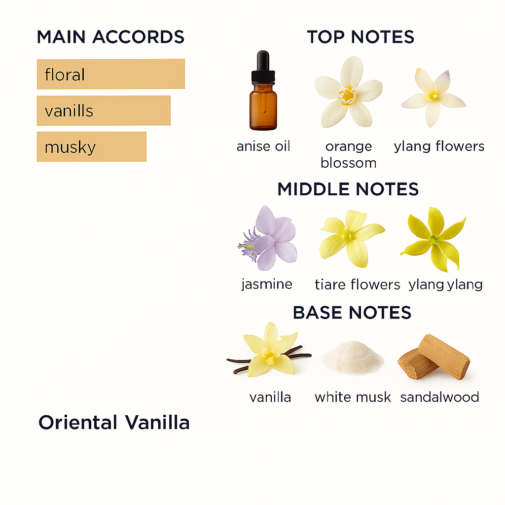 Base notes: vanilla, white musk, sandalwood