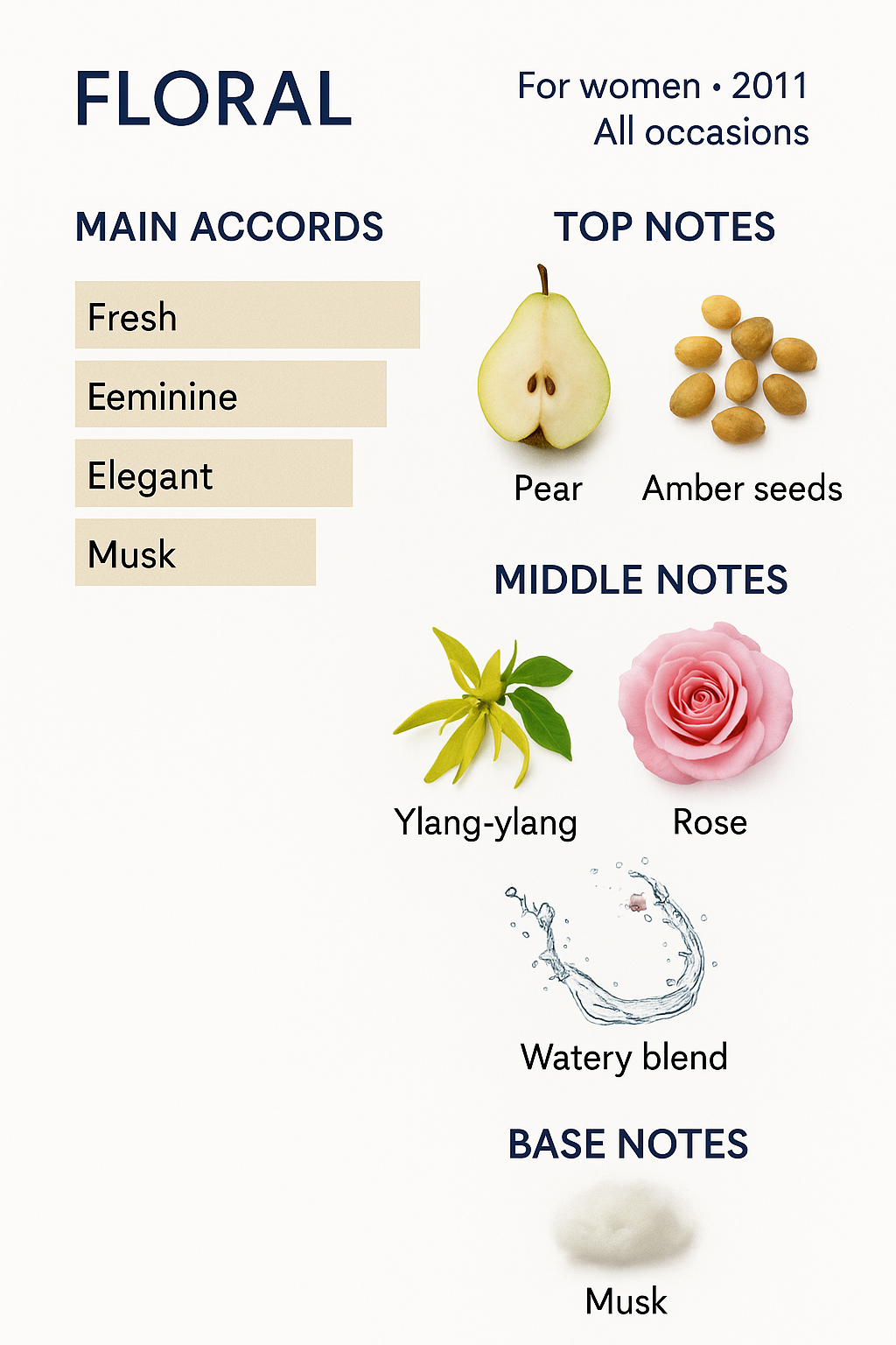Middle notes: Ylang-ylang, rose, and a watery blend
