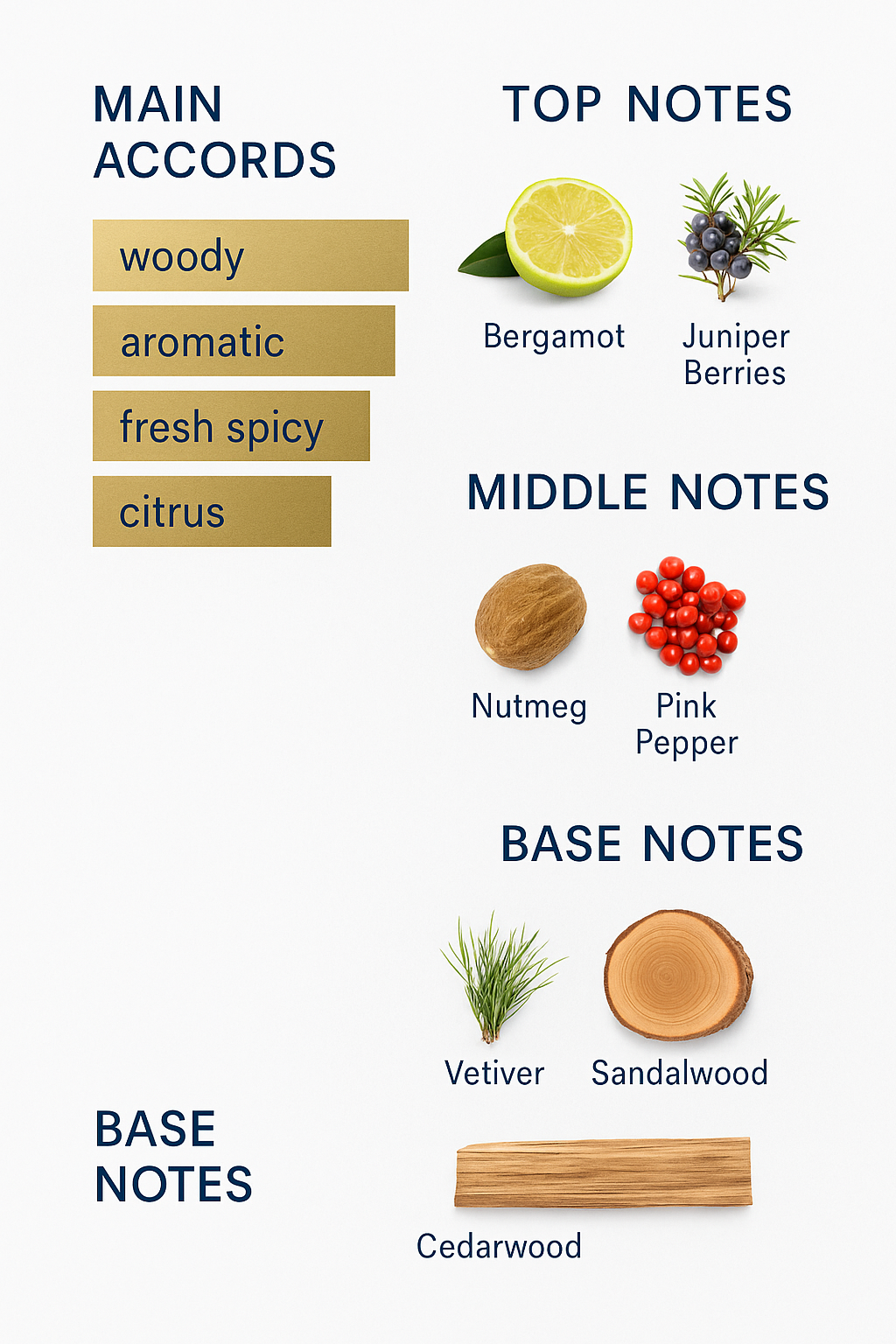 The top notes are fresh with bergamot and juniper berries. The heart has a bright mix of nutmeg and pink pepper. The base finishes with cedarwood, vetiver, and sandalwood.