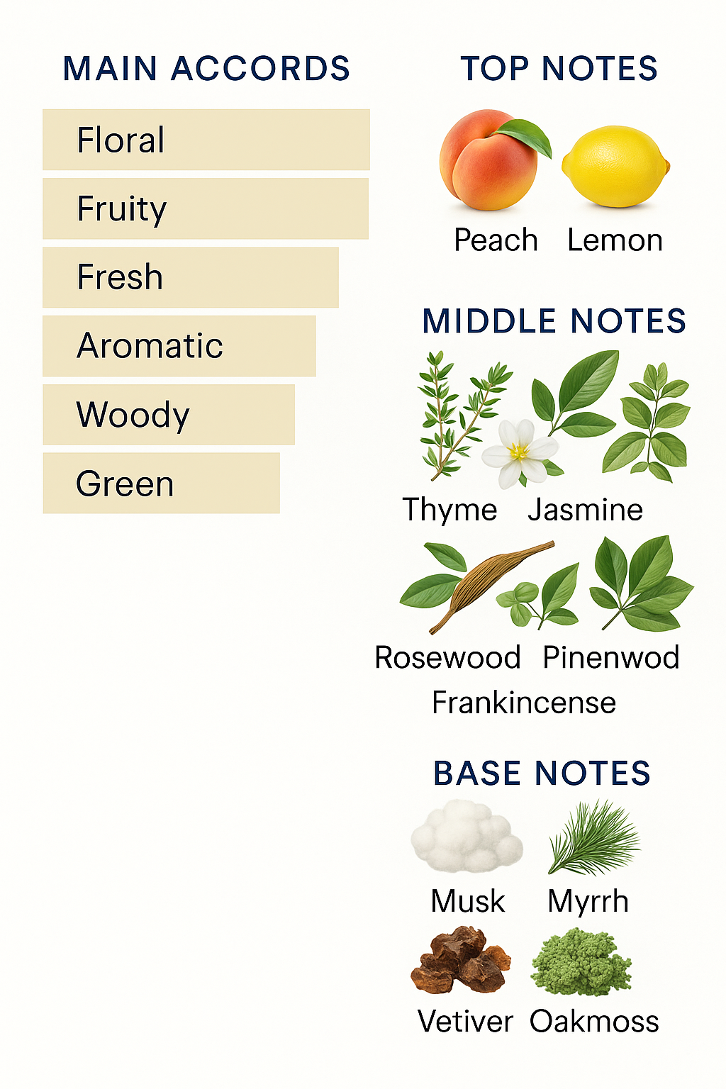The top notes are peach and lemon. The heart has a soft bouquet of thyme, jasmine, rosewood, green notes, pinewood, and frankincense. The base finishes with musk, myrrh, vetiver, and oakmoss.